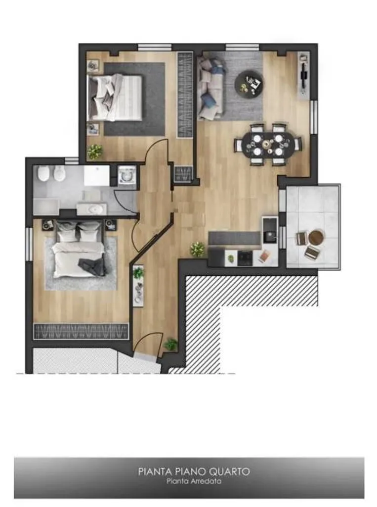 La zona notte, separata da un piccolo disimpegno, è composta da due ampie camere da letto matrimoniali e un bagno finestrato completo di doccia.