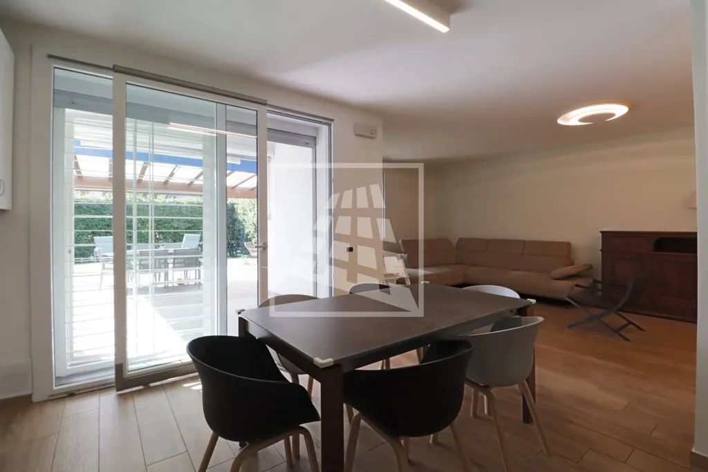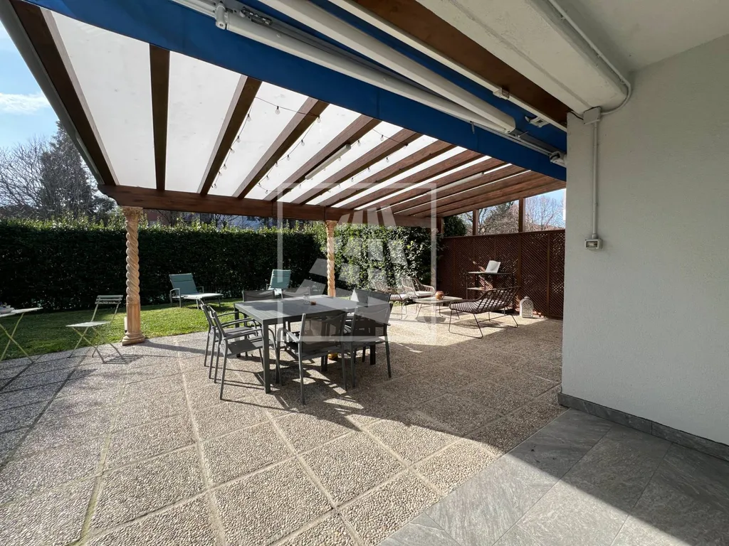 la zona giorno si apre su un generoso soggiorno che si estende verso l'esterno grazie a un portico di 10 mq, punto daccesso allampia area cortiliva privata di 350 mq che abbraccia l'abitazione su tre lati.