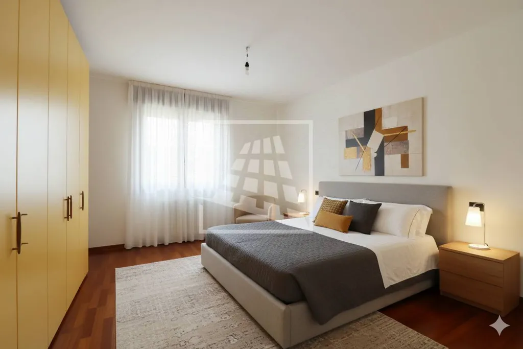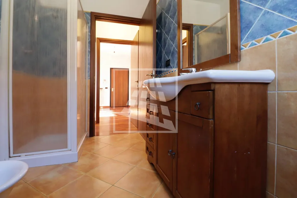 Un disimpegno conduce alla zona notte, ospitando una camera da letto matrimoniale, un bagno completo di finestra e box doccia in cristallo.