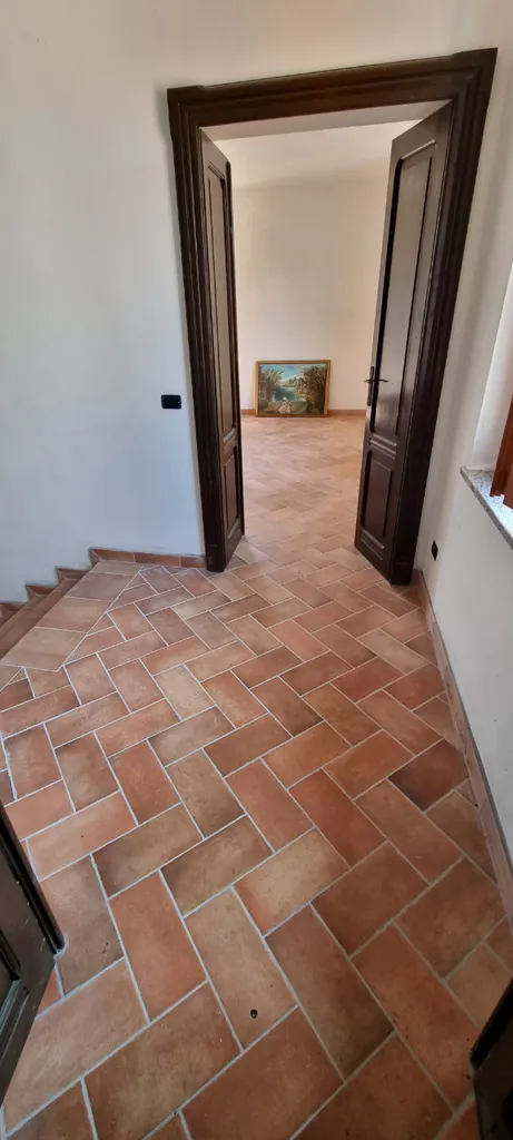 Piano interrato: cantina e centrale termica. Le finiture includono porte interne laccate bianche, infissi in legno con vetrocamera doppia e pavimentazione in monocottura, che donano eleganza e continuità agli ambienti.