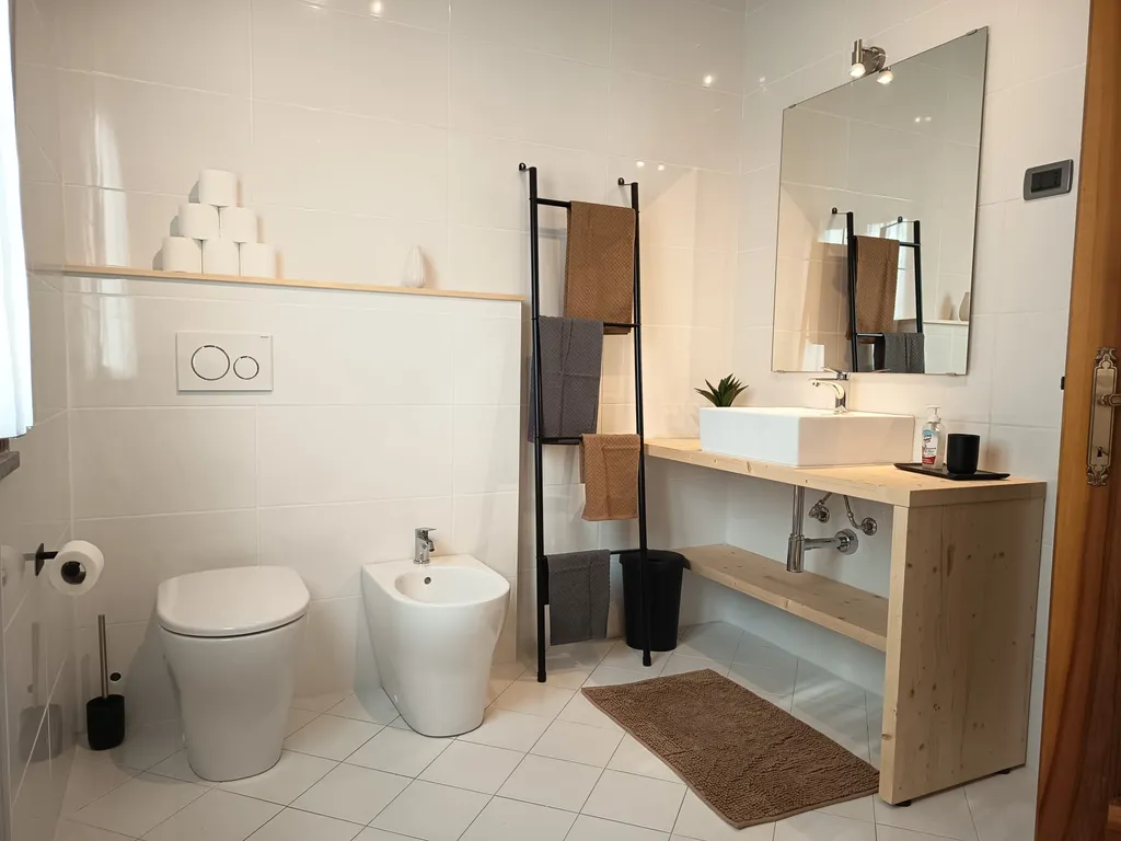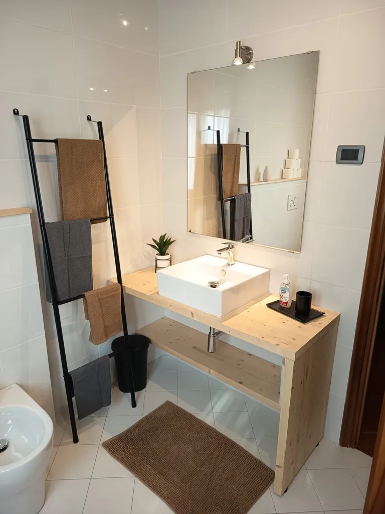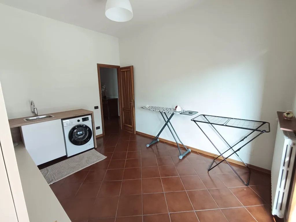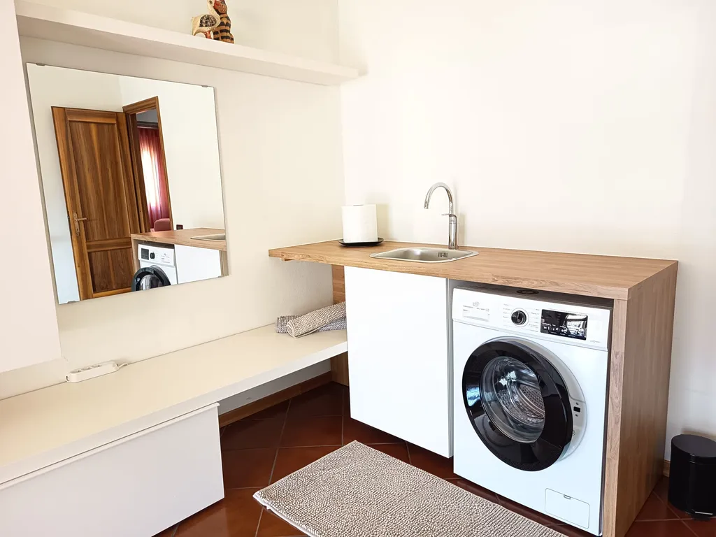 Lavanderia nuova con lavello, lavatrice, stendibiancheria, aspirapolvere, asse e ferro da stiro, materiale per pulizie, zona relax e deposito.