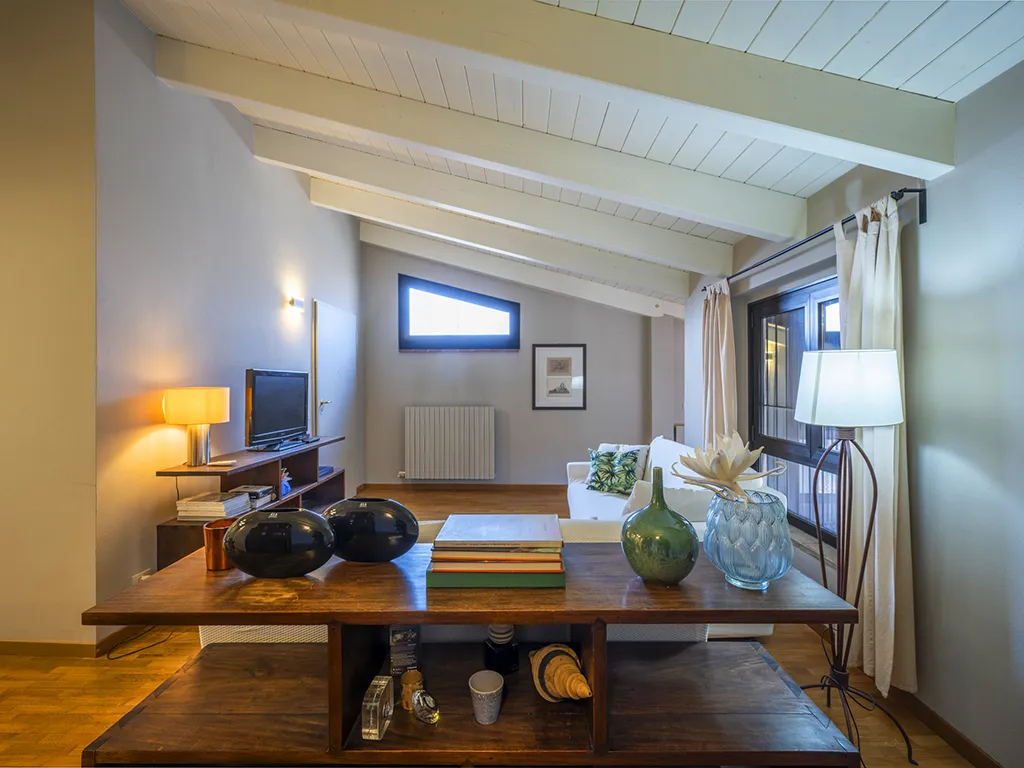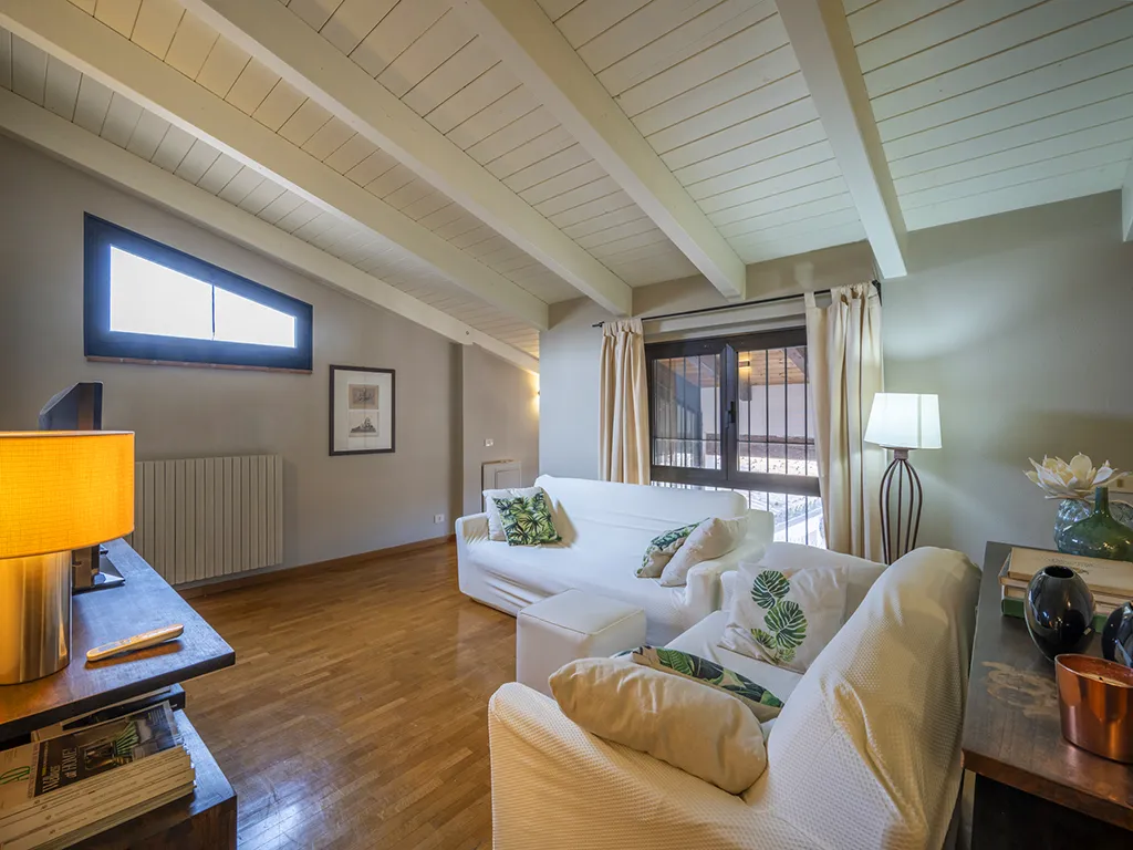 - soggiorno con travi in legno sbiancato con ampi volumi, oltre ad angolo studio;