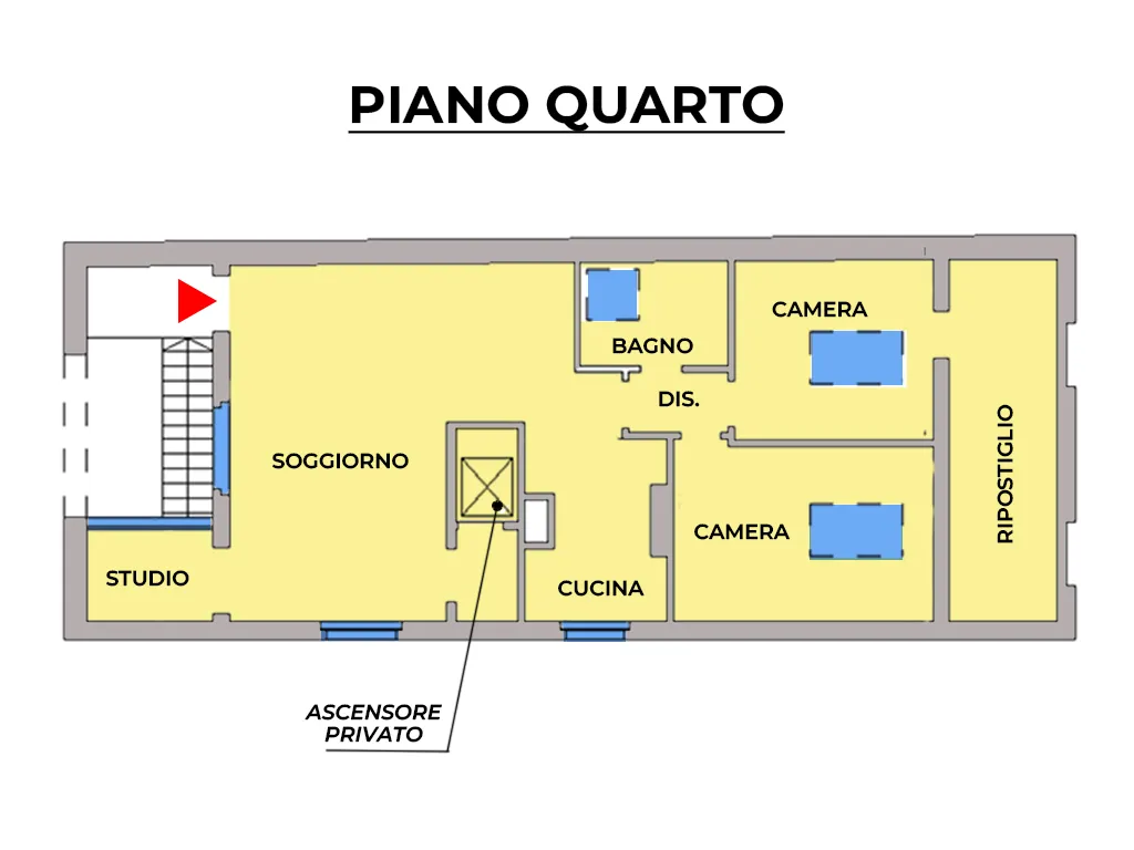 - Doppio ingresso, di cui uno con accesso diretto raggiungibile con ascensore privato.