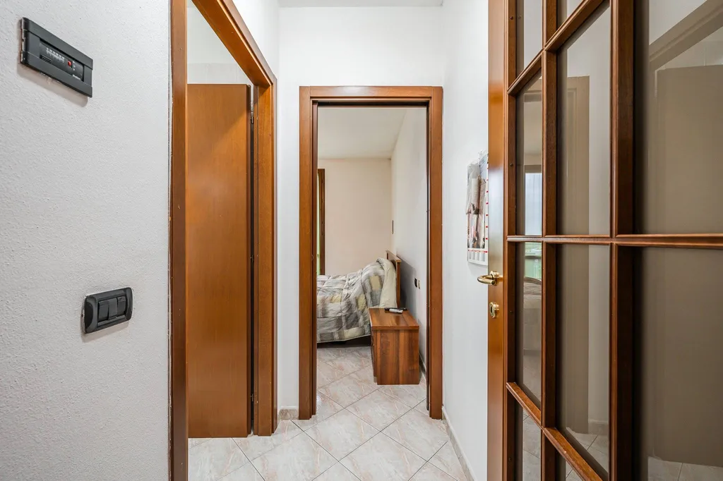 ingresso su soggiorno con cucina a vista ed accesso al primo balcone esposto a Sud, disimpegno della zona notte, una camera da letto matrimoniale con secondo balcone esposto a Nord e bagno finestrato con box doccia.