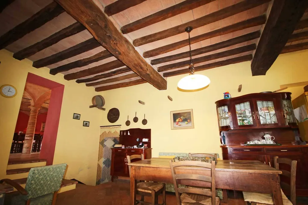 ingresso privato dal grande porticato di 40 mq., dominato da imponenti pilastri in vecchi mattoni di cotto a vista, suggestivo salone con colonnati in pietra, spaziosa cucina abitabile affacciata sul secondo porticato, prospiciente la piscina delle dimensioni di ml 11x4.. Disimpegno notte, 2 comode camere da letto matrimoniali e sala da bagno.