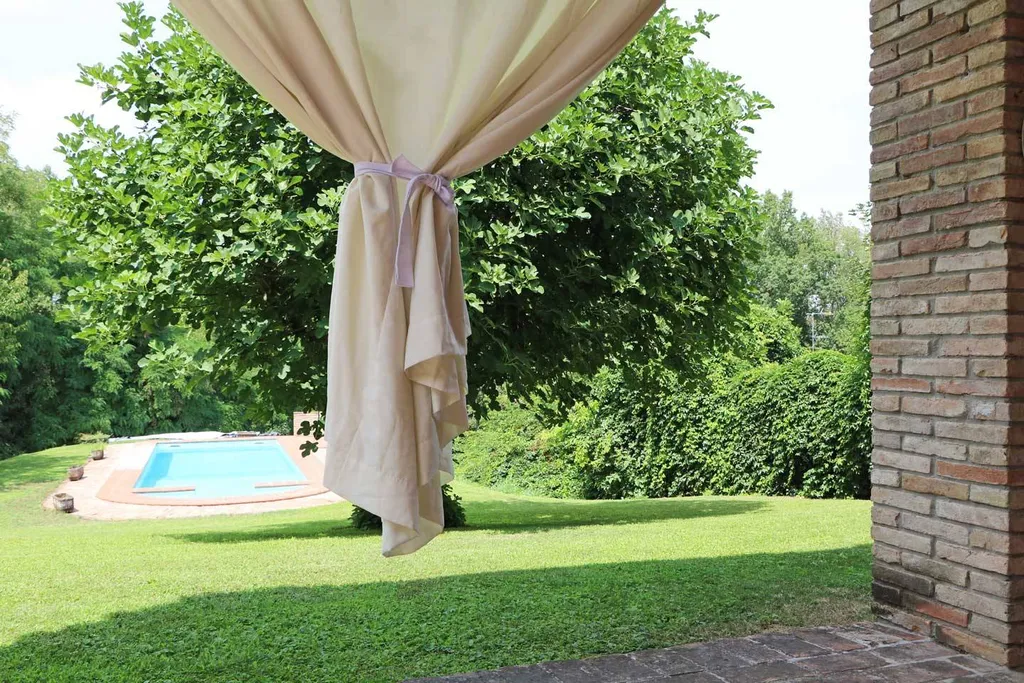 La piscina posta nel giardino in prossimità del torrente invita a piacevoli letture, momenti di relax, svago e cene conviviali in attesa del tramonto. Il grande porticato aperto sul verde calamita lo sguardo e rilassa lo spirito.
