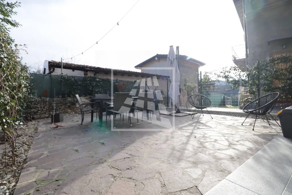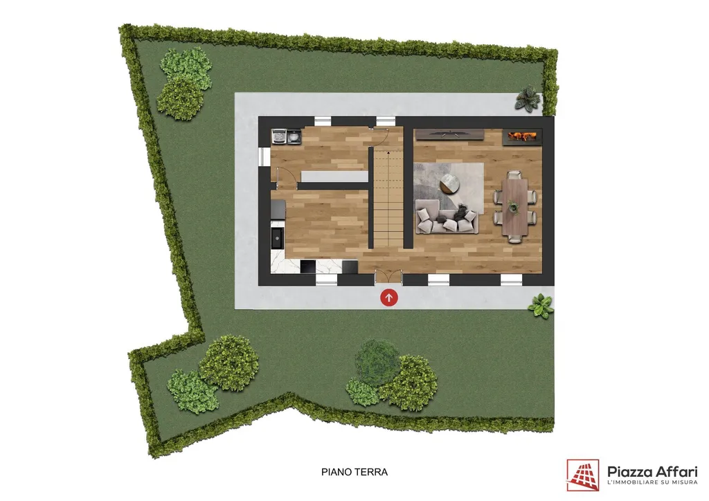 Il piano terra accoglie un'area cortiliva che abbraccia l'abitazione su tre lati e si compone di ingresso, zona living con stufa a pellet, cucina abitabile già arredata e un pratico ripostiglio ad uso lavanderia.