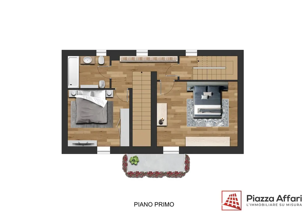 Il primo piano, raggiungibile tramite la scala interna, ospita due camere da letto matrimoniali, di cui una servita da un balcone affacciato direttamente sul verde, e un bagno moderno completo di finestra e doccia walk-in.