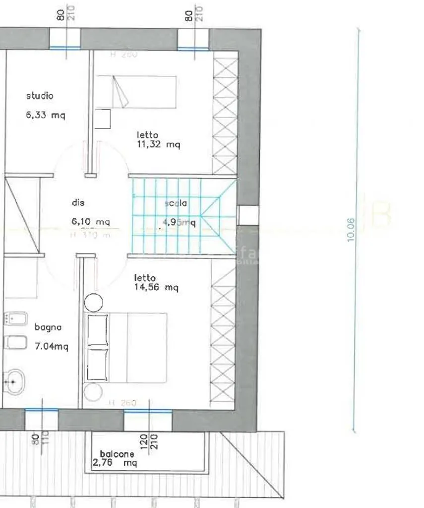 Il primo piano di circa 67 mq ospita la zona notte con un disimpegno, camera matrimoniale di 14,50 mq con balcone, camera singola di 11,30 mq e studio di 7 mq, bagno finestrato.