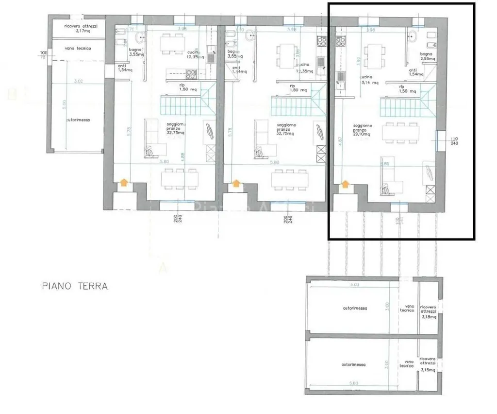 ingresso tramite giardino e porticato, ampio soggiorno di 28 mq, cucina abitabile di 15 mq aperta sul soggiorno, anti-bagno e bagno finestrato, ripostiglio.
